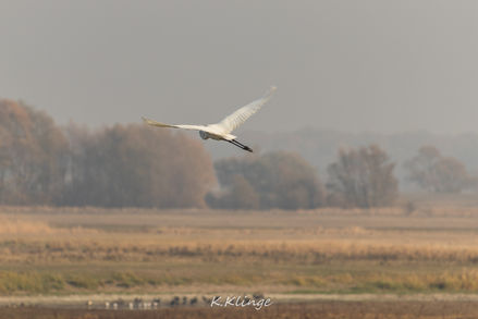 Auch wenn der Tag grau in grau beginnt (& bleibt), nehme ich mir den zur Verfügung stehenden Drahtesel, um das Umland zu erkunden. Nach all meinen Mountainbike-Jahren ist so ein Hollandrad mit drei Gängen & Rücktritt schon arg gewöhnungsbedürftig. Vor allem mit Kamera & Rucksack. Von außen betrachtet sieht es sicher wie mein erstes Mal Radfahren aus. Der Drahtesel & ich müssen also erst noch warm werden. Direkt hinter dem Haus beginnt die Aland-Elbe-Niederung. Nichts, soweit das Auge reicht. Da ich auf einem Deich stehe, kann ich das ganz gut beurteilen. Der Radweg schlängelt sich mit dem Deich durch die Landschaft, am Aland, an weiten Wiesen & kleinen Wäldchen entlang. Mir entgeht nicht die absolute Stille, lediglich durch Vogelrufe unterbrochen. Ein Mäusebussard sitzt im Baum & sucht das Weite, als ich ihm zu bunt werde. Ich folge dem Weg bis nach Wanzer, dem nächsten Örtchen Richtung niedersächsische Grenze, Grenzdorf. Ebenfalls ruhig & ein bisschen wie aus einer anderen Zeit. Die Kirche gefällt mir. Ich bin aber eher auf tierische Besonderheiten aus, weshalb ich kein Foto vom Ort mache. Auf einer großen Brücke überquere ich den Aland & sehe den ersten Silberreiher. Mir gefallen die dunkel-grünen Farben & sein weißes Gefieder im Kontrast dazu. Ruhig liegt der Aland da. In seinem weiterem Verlauf sehe ich immer wieder die Silberreiher, sie sind nur so unheimlich scheu. Zudem macht der Drahtesel ein (lautloses) Anhalten schwer, das muss ich definitiv noch üben. Neben den Reiher sind auch die winter-gastierenden Enten & Gänse zu sehen. Immer noch das weite Land um mich herum. Und dann fliegt über mir mein erster Kranich. Und Gänse, viele Gänse.