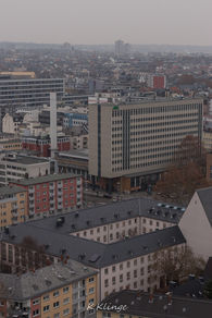 Aus welchen Gründen auch immer hatte ich mehr von diesen Wolkenkratzern (das deutsche Wort musste ich ernsthaft nachlesen) in Erinnerung, ich bin fast etwas enttäuscht. Ich gehe durch die ein oder andere Straßenschlucht. Für ein Foto kann man schon mal auf der Straße stehen bleiben. Ein Düsseldorfer verursacht ein südhessisches Hupkonzert - und ich bin es nicht. Ich habe das Gefühl, dass die Größe der Skyscraper durch die übrigen hohen Häuser der Stadt etwas relativiert werden. Wo man wieder beim Gedanken wäre, Höhe ist immer relativ. In diesem Fall variiert die Höhe der Wolkenkratzer zwischen gut 100 Meter bis zu 259m (die Commerzbank hat wirklich alles gegeben), Fernsehturm mit 337,5m ausgenommen. Alles darunter ist zwar immer noch viel zu groß für diese Welt, aber im Verhältnis klein. Egal wie hoch sie am Ende sind, sie überragen einfach alles. Frankfurt besitzt nicht umsonst 15 der 16 deutschen Wolkenkratzer & nur drei Städte in Europa haben mehr dieser Türmchen. Mainhattan eben.