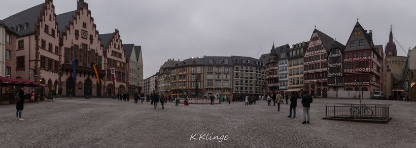 Über die neue Altstadt geht's Richtung Römer. Einen Teil der Häuser der Neuen Altstadt hat man original rekonstruiert, die anderen neu aufgebaut. So sieht es hier auch aus. Ziemlich neu. Die Stadttouristik wirbt mit einem Satz, den auch ich schon öfters heute gedacht habe: eine gelungene Mischung (darüber bin ich mir ehrlicherweise noch nicht ganz sicher) aus Alt und Neu, aus Geschichte und Gegenwart. Den Römer und seinen Berg habe ich so kein Stück in Erinnerung, obwohl ich genau weiß, dass ich schon einmal hier war. Der Römer, das historische Rathaus aus dem 13. Jahrhundert, mit seiner nicht zu verwechselnden Farbe sieht gut aus. Der Kran dahinter ist nicht ganz so stilsicher, aber nun gut. Der Platz zieht für gewöhnlich Massen an Touristen an, heute ist es relativ leer (Mitte Januar ist nicht die typische Hochsaison der typischen Touristen), aber was darf nicht fehlen - die japanische Reisegruppe. Und die absolut klischeehaften Souvenirläden.