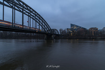 Am Eisernen Steg überquere ich den Rhein abermals. Ich will die Skyline unbedingt einmal rundum sehen, aber mir läuft die Zeit davon, denn mein Zug geht bald. Und es wäre etwas ungünstig, wenn ich ihn verpasse. Als Supersparpreis-Fahrer ist man nämlich sehr zuggebunden & wenn man den verpasst, wird aus einer sehr günstigen Reise eine sehr teures Vergnügen. Aber ich lasse es mir nicht nehmen, auch die Untermainbrücke zu passieren, um am Holbeinsteg wieder auf die Seite überzusetzen, die den Hauptbahnhof beheimatet. Es ist so kalt, trotzdem sind reichlich Menschen unterwegs. Vielleicht waren es aber auch überwiegend Sportler, die hier ihre Runden drehen - so genau habe ich es nicht mehr in Erinnerung.