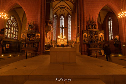 Wenig später stehe ich vor einem weiteren Wahrzeichen der Stadt. Dem Dom. Genauer gesagt, dem Kaiserdom St. Bartholomäus. Imposant, keine Frage. Wie man sieht, auch so ein Gebäude, wo kein Foto richtig gelingen will. Begehbarer Turm - unausweichlich, das muss ich machen. Der freundliche Mann am Schalter fragt mich, ob ich denn die nächste Zeit in die Berge fahren würde, mit dem Rucksack sähe ich ja so aus. 328 Stufen, 66m, aber ich sei ja sportlich, kein Problem. Natürlich nicht. Naturtalent in Turmbesteigungen. Und für die Aussicht würde ich das jederzeit wieder tun. Trotz grauen Himmel ist die nämlich ziemlich grandios. Ich nehme mir jede Menge Zeit, die Stadt bis in Kleinste auszuspähen. Da bietet sich so die ein oder andere Perspektive. Und schlussendlich dreht sich alles um die Skyline. Ausgezeichnete Investition von 3€.