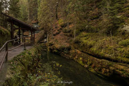Zur Klamm geht es reichlich steil bergab. Eine Gruppe wurde mit dem Bus vorgefahren, na, da lag ich gar nicht so schlecht mit meiner Busgruppen-Vermutung. Ich lasse die erst einmal vorbeigehen & beschaue mir das baufällige Haus am Hang. Es ist wunderschön, leider hoffnungslos baufällig, wahrscheinlich hochgradig einsturzgefährdet. Da fallen selbst die Regenrinnen verbogen ab. Schade. Es würde mich mal interessieren, was solche Häuser noch kosten. Der Weg bleibt steil & rutschig. Die vier Engländer mit ihrem Fremdenführer (anscheinend habe ich sie heute schon einmal gesehen..) kommen mir entgegen. Der erzählt gut, ich lausche ein bisschen seinem Vortrag. Für mich könnte ich mir so etwas nicht vorstellen. Der Himmel ist inzwischen durchgehend blau-weiß, wie die Schalke 04-Mütze eines Entgegenkommenden. Endlich erreiche ich die Klamm, den Fluss Kamenice, zu deutsch Kamnitz. Er ist ein Nebenfluss der Elbe & überwindet auf seinen gut 37km zur Elbe einen Höhenunterschied von fast 500 Metern. Der Name bedeutet so viel wie Fluss mit steinigen Bett. Kalt ist es hier, aber nicht unangenehm.