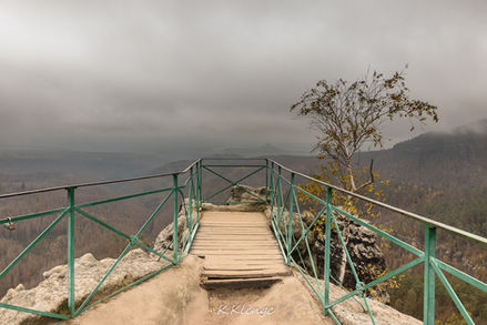 Ich bleibe nicht lange allein. Wieso müssen eigentlich alle so laut sein, wenn sie zusammen unterwegs sind? Es ist sandig hier. Noch schwanke ich, welche Schweiz die schönere, diese oder die in Luxemburg. Noch liegt Luxemburg vorn. Am Olgasturz geht's über kleine Brücken serpentinenartig bergauf. Sieht klasse aus. Der Herbst hat die perfekte Farbe. Und das grau-neblige Wetter passt. Auch, wenn dadurch der Himmel langweilig-weiß wirkt & erhöhte Verwacklungsgefahr aufgrund niedriger Verschlusszeiten herrscht. Relativ schnell bin ich an der ersten Felsformation angelangt - es ist das Prebischtor, auch wenn mir das noch nicht ganz klar ist. Das Verkehrsaufkommen nimmt zu, ich mache erst noch einen Abstecher zur Höhle der Böhmischen Brüder, einst wohl die Zufluchtsstätte einiger Einheimischer in kriegerischen Zeiten. Und die ist wirklich beeindruckend. Dass dieses Gestein doch so widerstandsfähig ist. Die ganzen Löcher kommen wohl nicht von Wind & Wasser sondern vom Ameisenlöwen, der Larve der Ameisenjungfern (einem nachtaktiven Netzflügler), die sich ins Gestein eingräbt & wohl vorbeilaufende Ameisen & ähnliches schnappt.